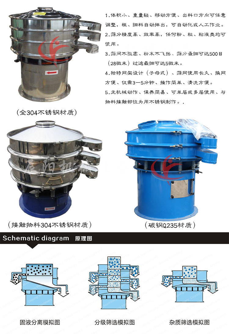 超聲波振動篩是將220v、50HZ或110v、60HZ電能轉化為38KHZ的高頻電能,輸入超聲換能器,將其變成38KHZ機械振動,從而達到**篩分和清網的目的。改系統在傳統的振動篩基礎上再篩網上引入一個低振幅、高頻率的超聲波振動波(機械波)在篩網上面疊加一個高頻率低振幅的超聲振動儀,超微細粉體接受巨大的超聲加速度,使篩面上的物料**保持懸浮狀態,從而抑制粘附、摩擦、平降、等堵網因素。解決了強吸附性、易團聚、高靜電、高精細、高密度、輕比重等篩分難題,使超細微粉篩分不再難事,特別適合高品質、精細粉體的用戶使用